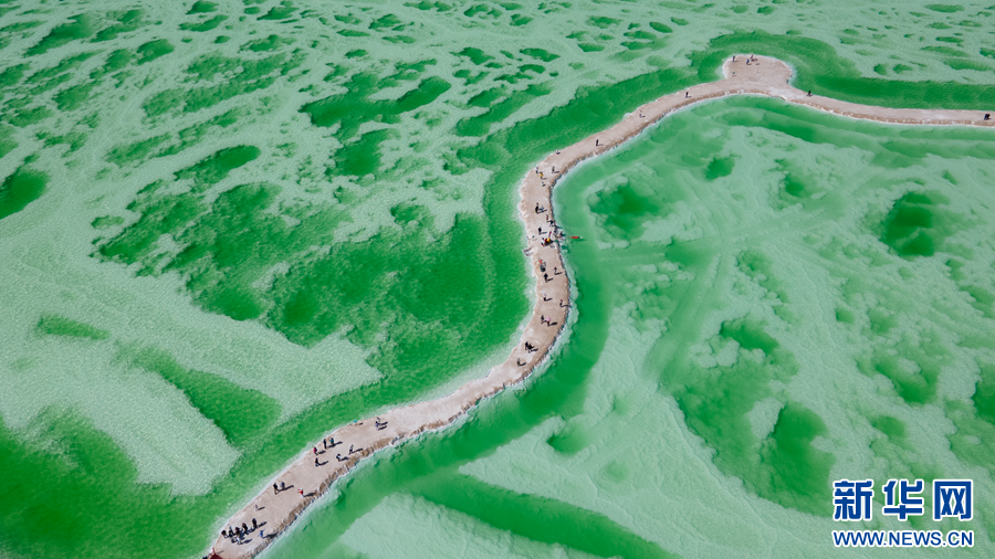 茫崖翡翠湖位于青海省海西蒙古族藏族自治州茫崖市花土溝鎮,屬于硫酸鎂亞型鹽湖,由于所含礦物質濃度的不同,在陽光的映照下,湖水呈現出深淺不一的翠綠色,就像無數塊翡翠鑲嵌在大地上。從無人機視角望去,茫崖翡翠湖宛如色彩絢麗的油畫,清新的色澤,甜蜜又夢幻。