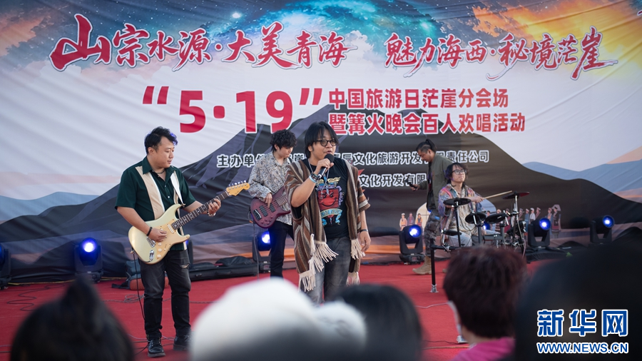 圖為茫崖市為專列游客準備的篝火晚會百人歡唱活動現場。(5月19日攝)
