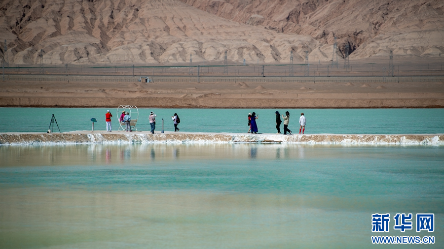 5月19日,專列游客在茫崖市翡翠湖景區游玩。